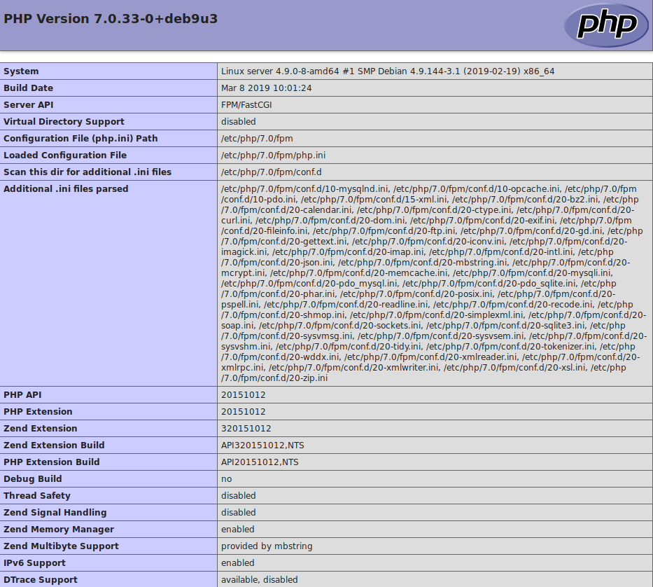 Bir web tarayıcısında sunucu IP'sindeki info.php dosyasını ziyaret edin. Sonuç, aşağıdaki ekran görüntüsüne benzer olmalıdır.